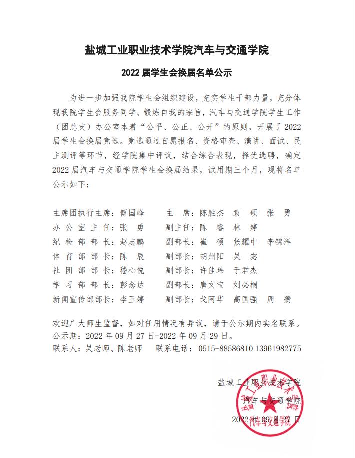 汽车与交通学院 2022届学生会换届名单公示