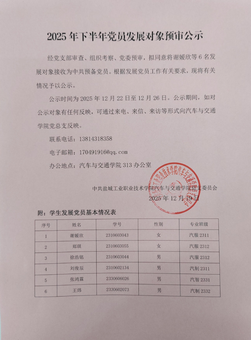 2025年下半年党员发展对象预审公示